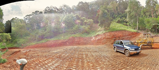 This panorama is taken from the north-eastern end of the platform. looking south-west. The sea is out beyond the left-hand edge of the picture, and behind the house site, to the right of the picture is the hillside that blocks out the summer sun from the north. The original house plan was for this site, but it was a long, narrow design which would have extended from where I'm standing taking the picture out along the curve of the hillside for almost 80 metres! What is not apparent from the photograph is that the left-hand edge of the house 'pad' is constructed from soil that has been pushed down and outwards from the hillside. This means that approximately half of the depth of the pad, from the left-hand edge that you can see in the picture to half-way across the stretch of red earth, is compacted soil lying on top of what was once a slope. Only the right-hand part of the pad, stretching back into the hillside is actually grounded on rock. Therefore we will be building up to the centreline of the pad, so that the weight of the house is carried over the rocky part of the pad, with only decking and/or terrace lying on the compacted soil - for obvious reasons.